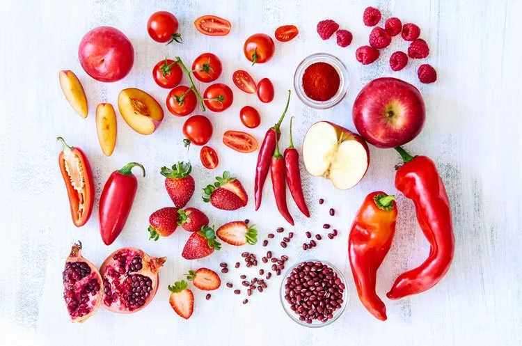 Examples: tomato, red capsicum, radishes, strawberries, rhubarb, cherries, red grapes, raspberries, watermelon, and red apples.