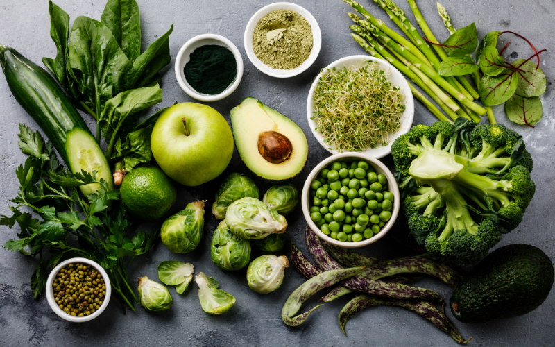 Examples: spinach, asparagus, avocados, broccoli, peas, green apples, green grapes, limes, kiwifruit, green beans, lettuce, cabbage, celery, cucumber, and green capsicum.