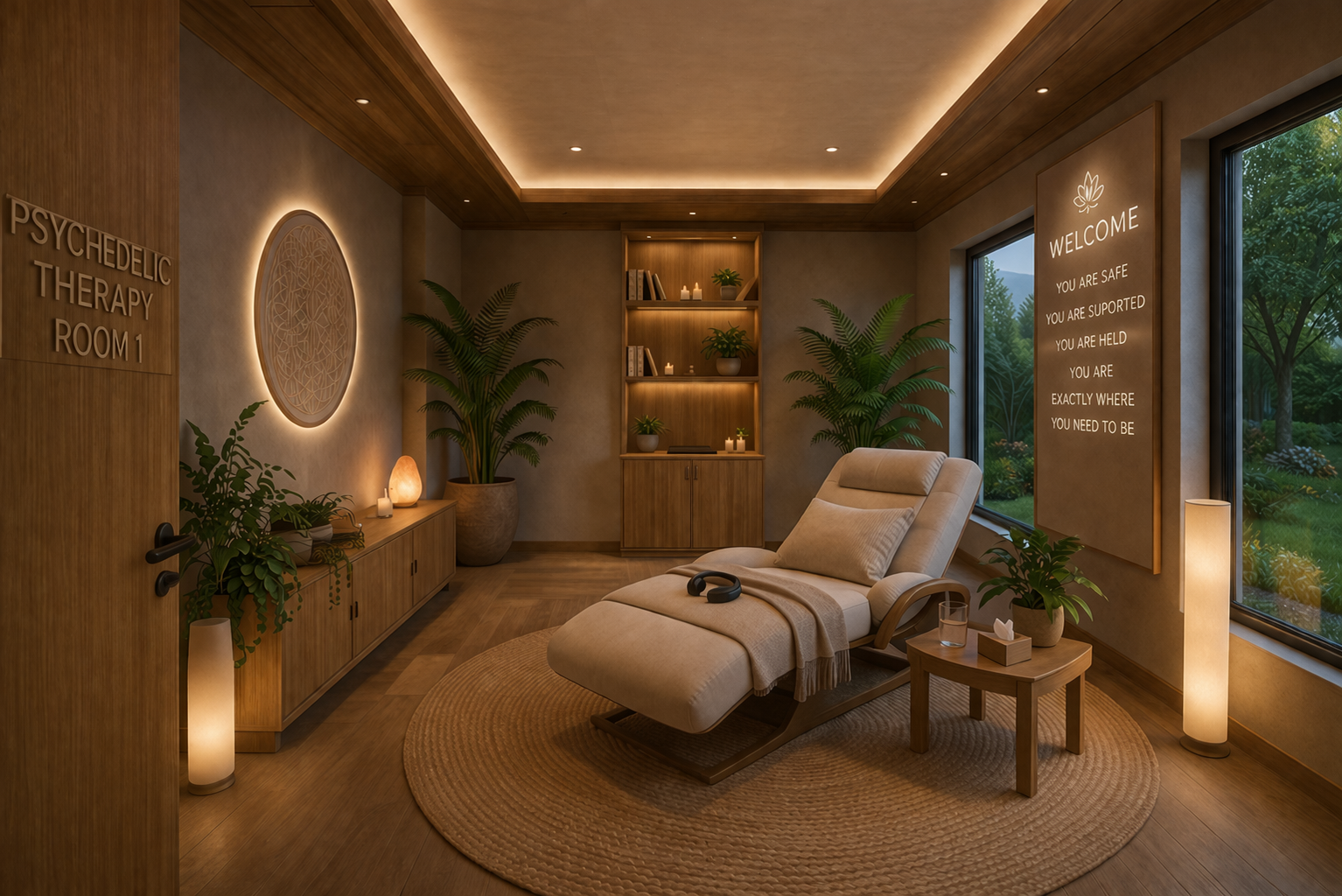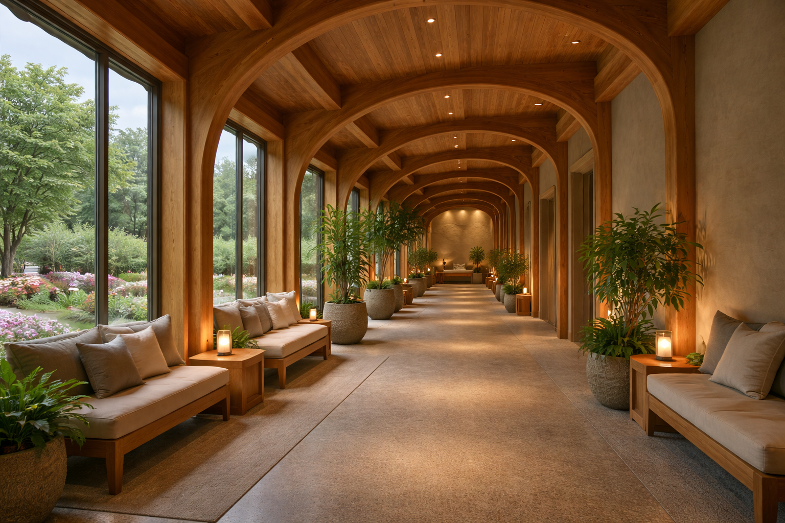 All renderings shown are AI-generated conceptual visuals inspired by the design ethos of world-renowned architect Tye Farrow, who will lead the design of the Richer Health Hotel + Wellness Centre. His award-winning salutogenic design principles are used in hospitals, schools, and wellness facilities in over 40 cities worldwide. Tye’s architecture is internationally celebrated for advancing health, humanity, and joy through design